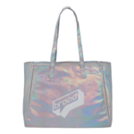 The Holographic Shopper Tote features a fun exterior holographic design and soft interior lining in the open main compartment.