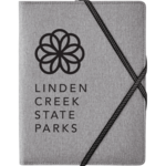 The Heathered Writing Pad features a fabric cover with interior organization for business cards, document pocket and pen loop. Exterior organization on back cover equipped with elastic strap closure. Writing pad has 20 sheets.